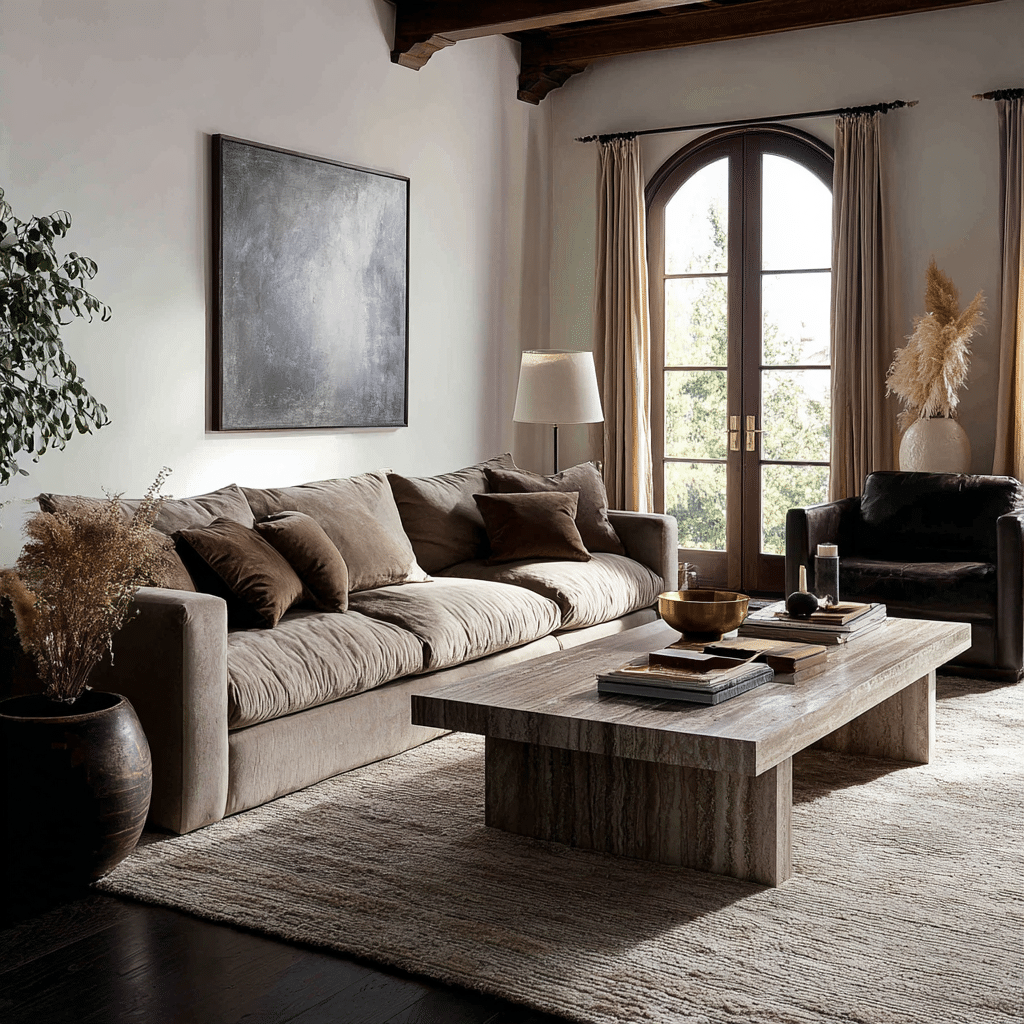Example: A cream bouclé sectional with a marble-topped side table, layered with silk throw pillows and a brass floor lamp that adds a warm glow without stealing the spotlight.