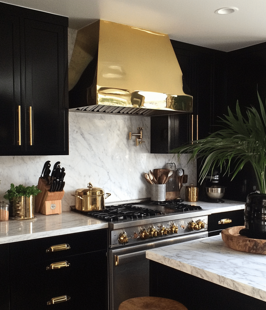 The black cabinets with gold hardware look so stylish, and the shiny gold range hood adds a glamorous touch.