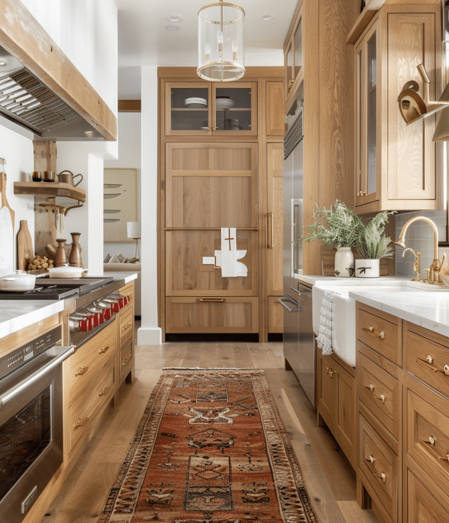 The natural wood elements, such as the cutting boards and woven rug, add texture and warmth, making this kitchen both functional and inviting.