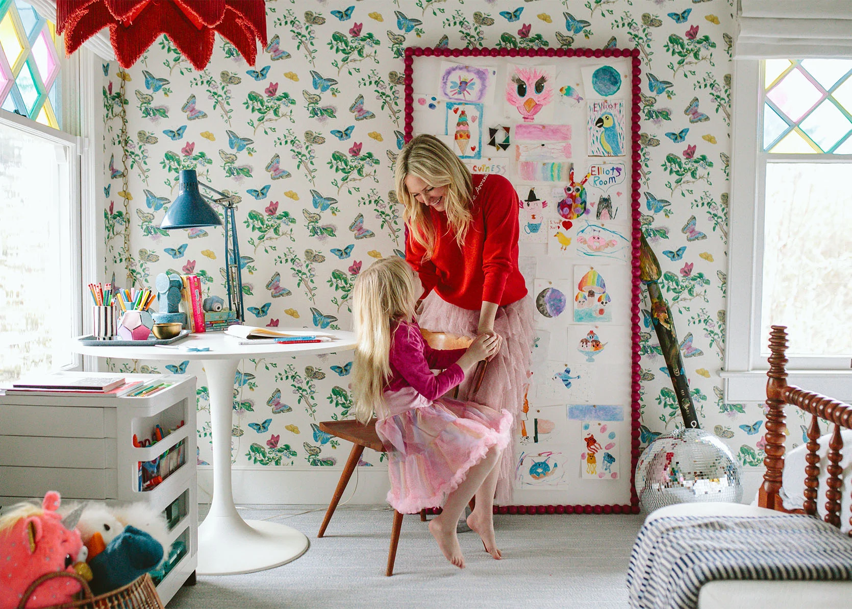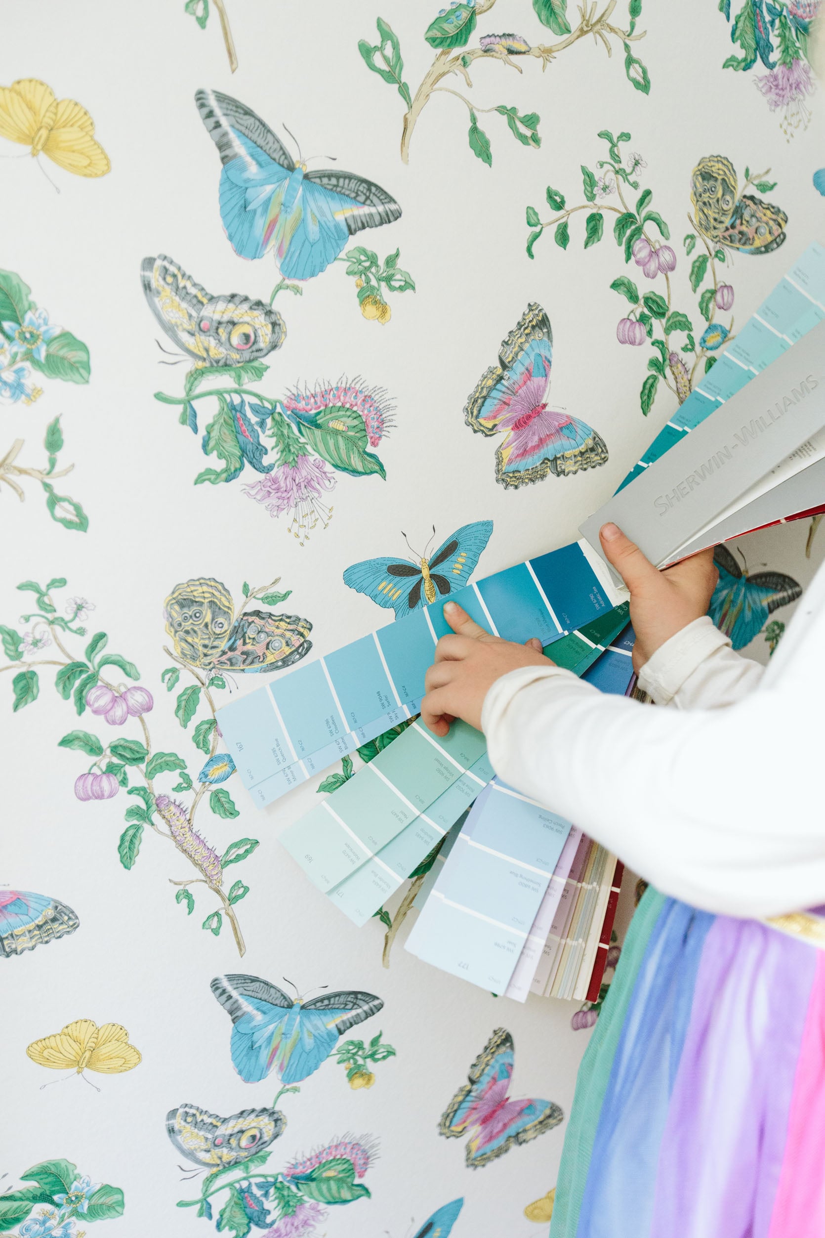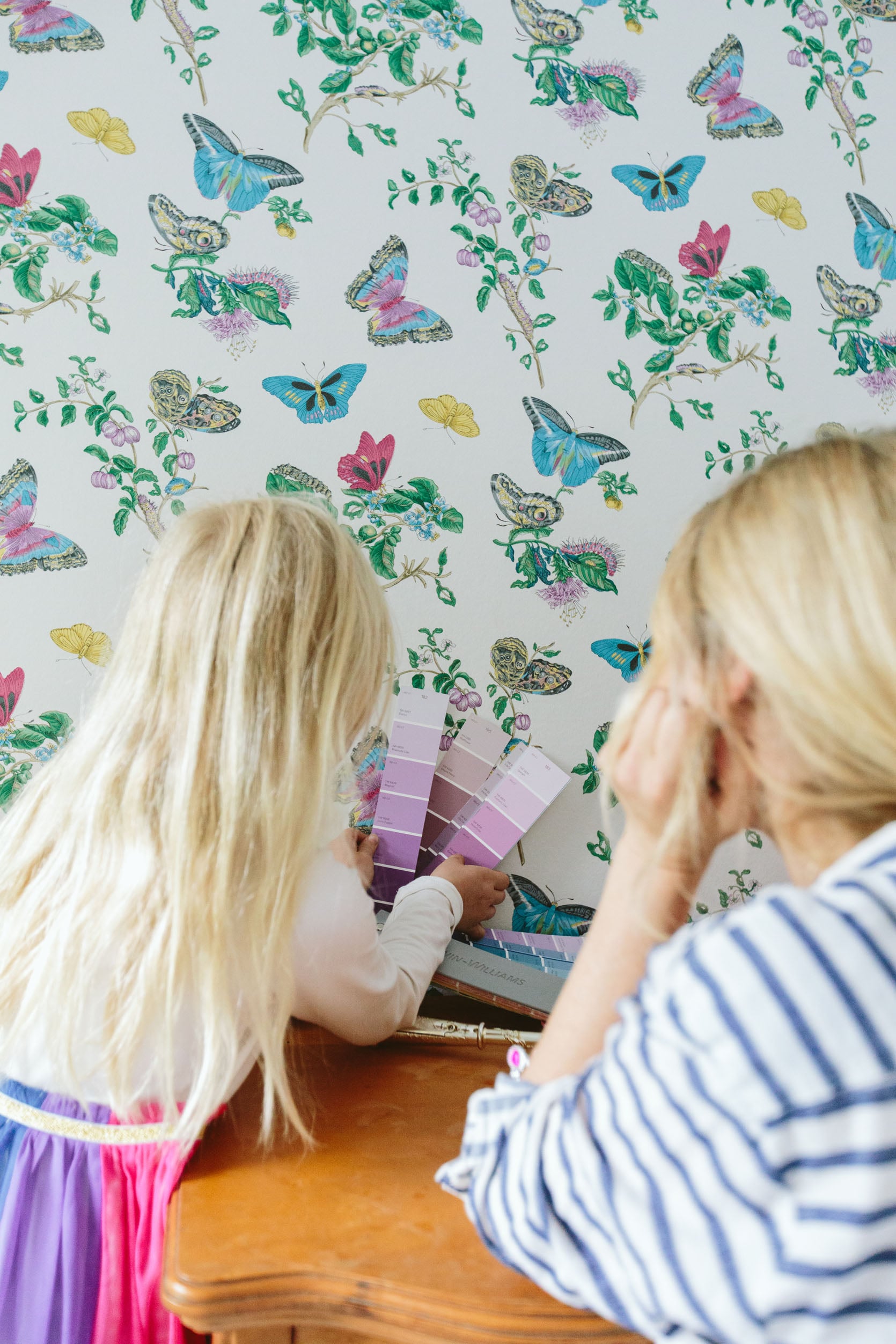Birdie thanks you readers for this change, and she’s very grateful (and excited) 🙂 Here’s what’s happening. he and i chose this wallpaper Many years ago (she was five when she first saw it), and we both loved how colourful, whimsical and happy it was (just like her). When we revealed the room (when she was 8 or 9) it was about a year later, when she (hesitantly at first) said it didn’t feel right to her anymore. And while I was disappointed, I also should have known better than to turn a child off style-wise so quickly, especially one who loves fashion and style and expresses herself so clearly through it. My style changed so much as she grew up (still has!!!!), she wants her room to be representative of who she is now – a little girl! And if I were a sensible mom, we wouldn’t be doing fancy wallpaper to allow for this kind of identity switch in the first place, but painting. so…