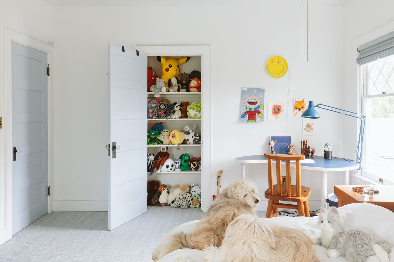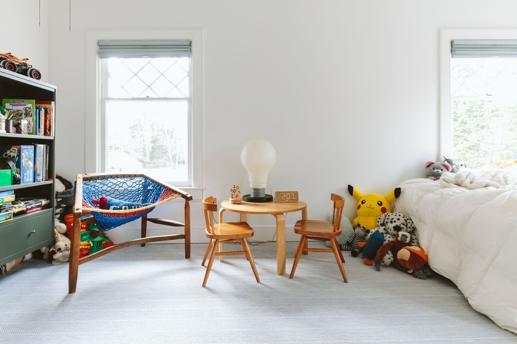 She’s starting to sleep much better, so there’s no chance we’ll be able to move her (at least for a while). It made me realize how wrong I was about big kids’ rooms. I always thought you organized them like any other room, but with more kids’ stuff. Definitely, safe, more storage, and avoid white carpet or glass tables. But same layout, just more fun. They obviously look better in the middle of the bed and not, you know, crammed against the window across two windows. (BTW, I put protective film on the window, so that if they break, they won’t shatter; they’ll just be attached with a big, clear sticker). But kids want flexibility and space. They don’t care about symmetry or balance. They want a bed in the corner so they feel comfortable, and then plenty of space on the floor to contend with.