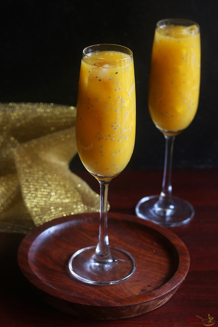 - Mango juice (with vegetable seeds) – The addition of sabja seeds makes this version taste similar to classic mango juice. Sabja seeds have no flavor of their own but it gives texture to the juice. Sabja seeds are great as a natural body coolant so when mixed with mango juice helps maintain balance. For this I used Banganapalli mango.