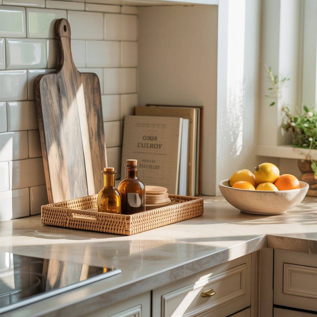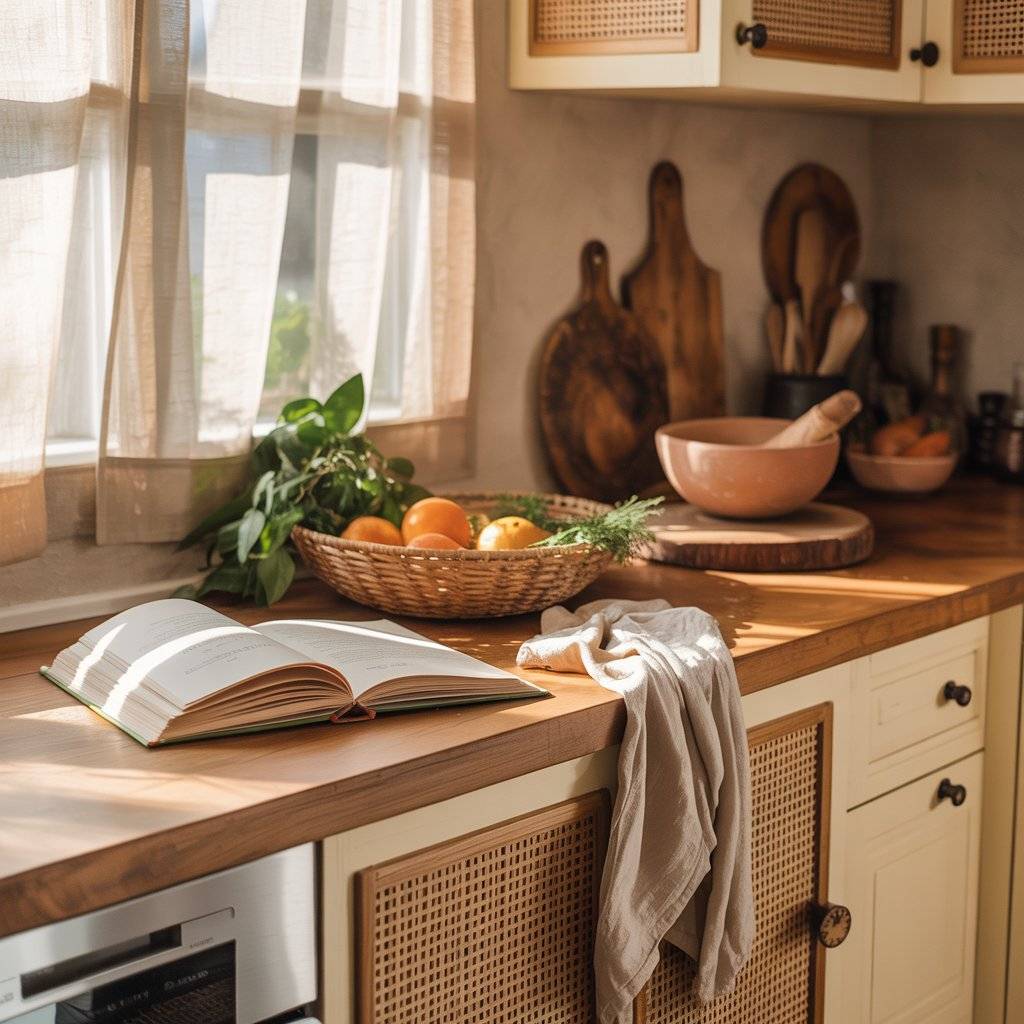 Countertops are often where clutter builds up. In a sunlit boho kitchen, I keep surfaces simple. Instead of many small items, group a few practical pieces together. A wooden cutting board leaning against the backsplash, a woven tray holding oils, and a ceramic bowl for fruit is often enough.