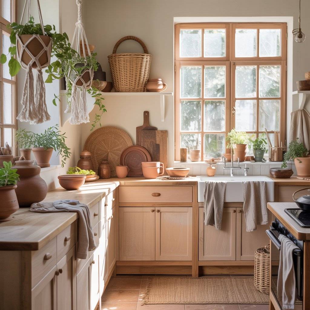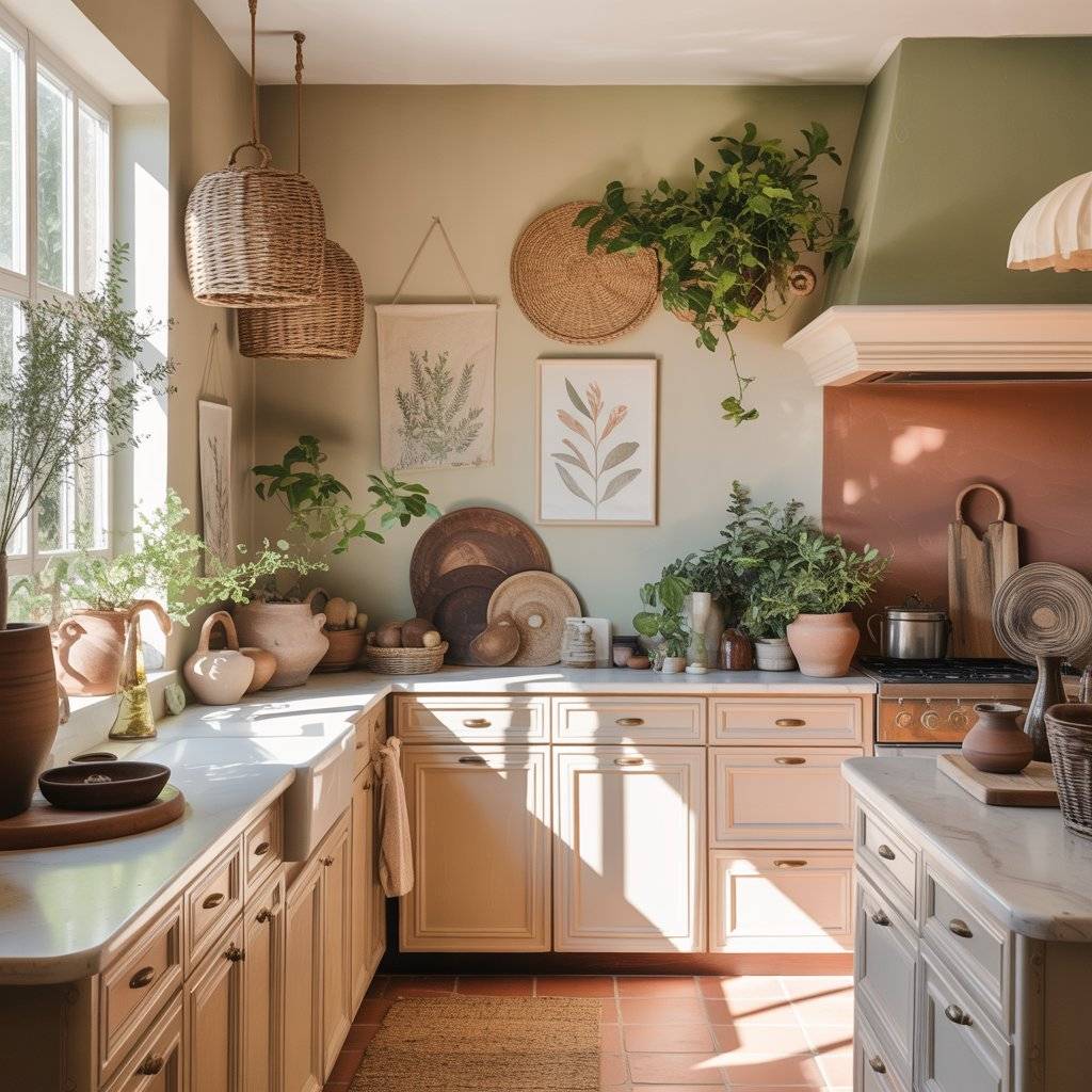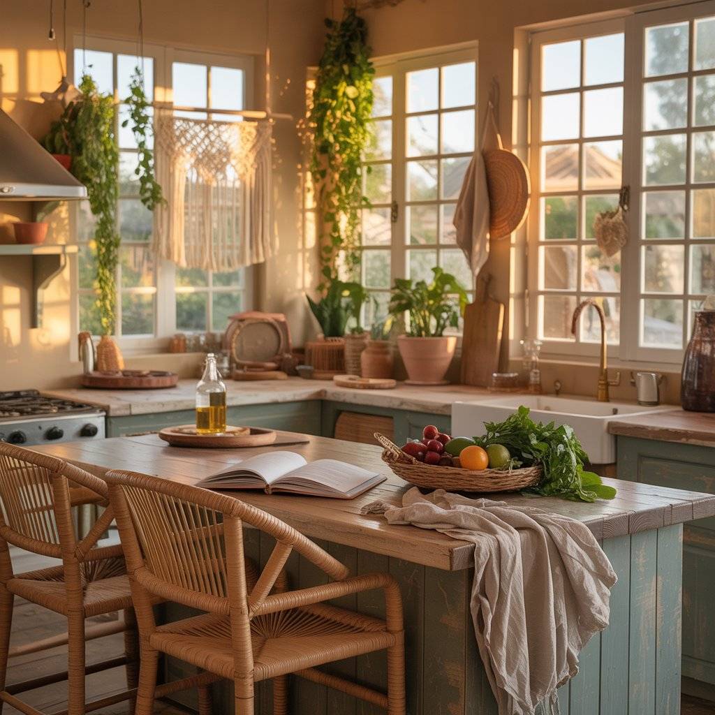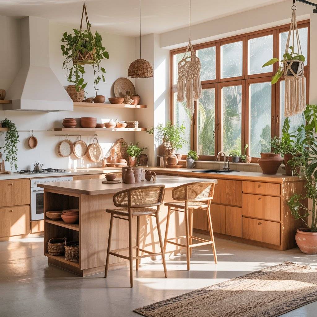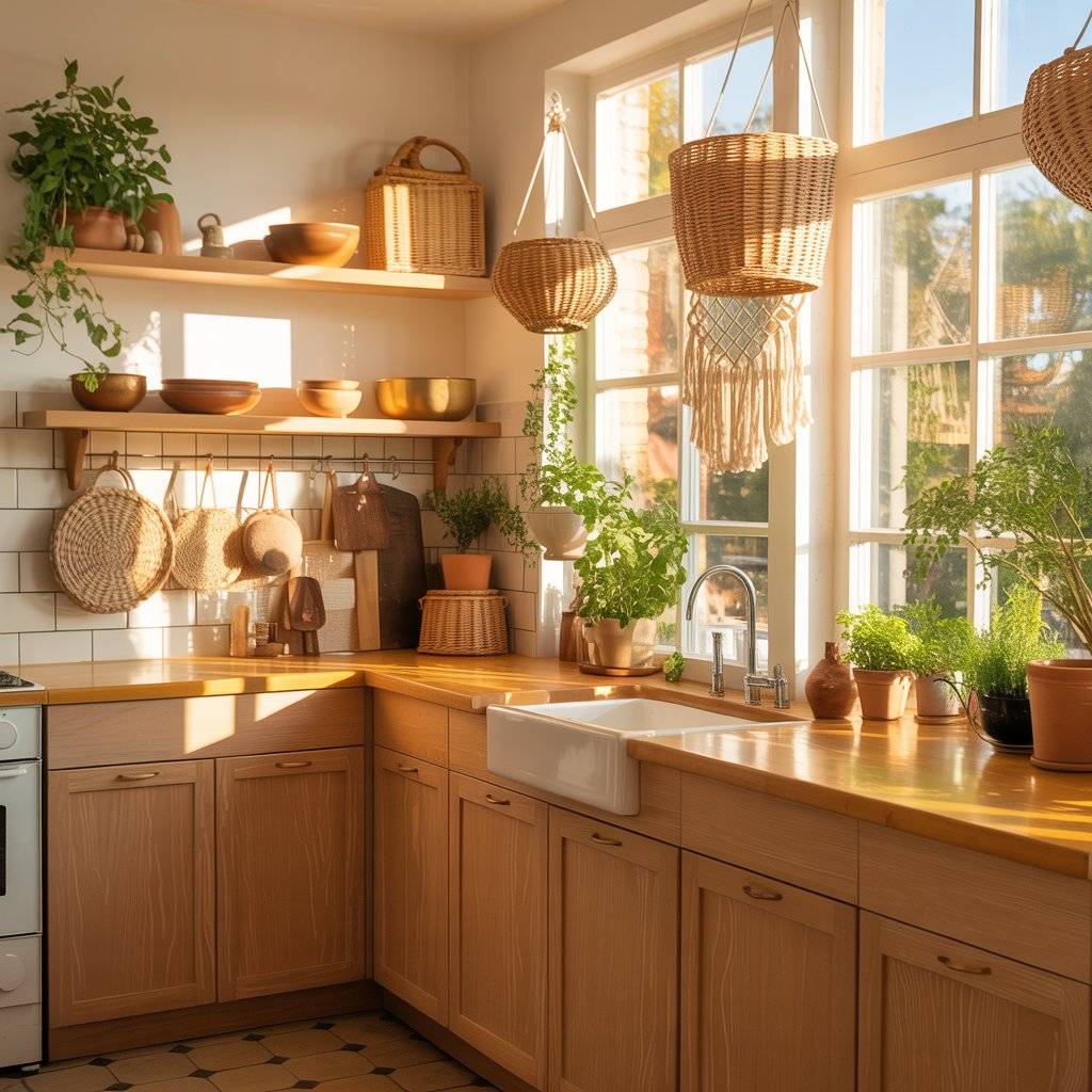 Green leaves against warm wood and woven textures create that relaxed, natural atmosphere that defines a sunlit boho kitchen design.