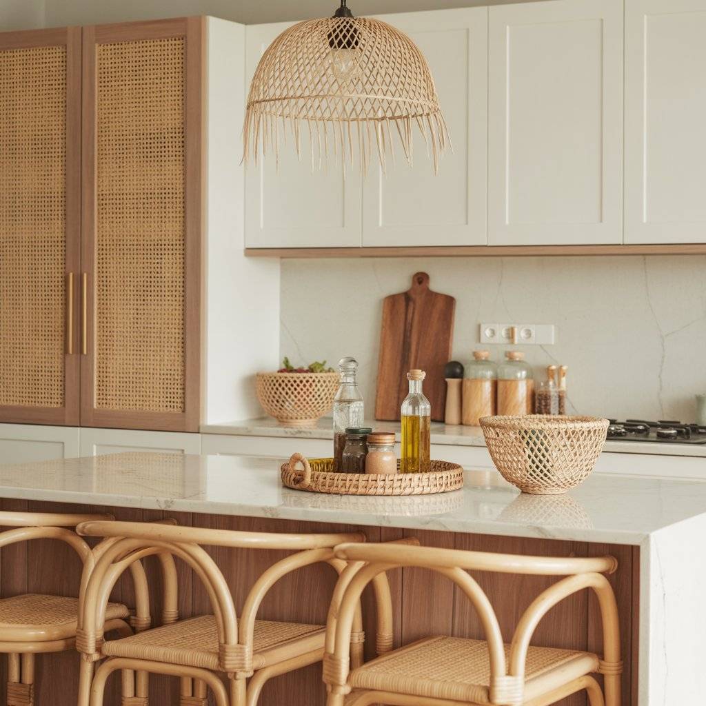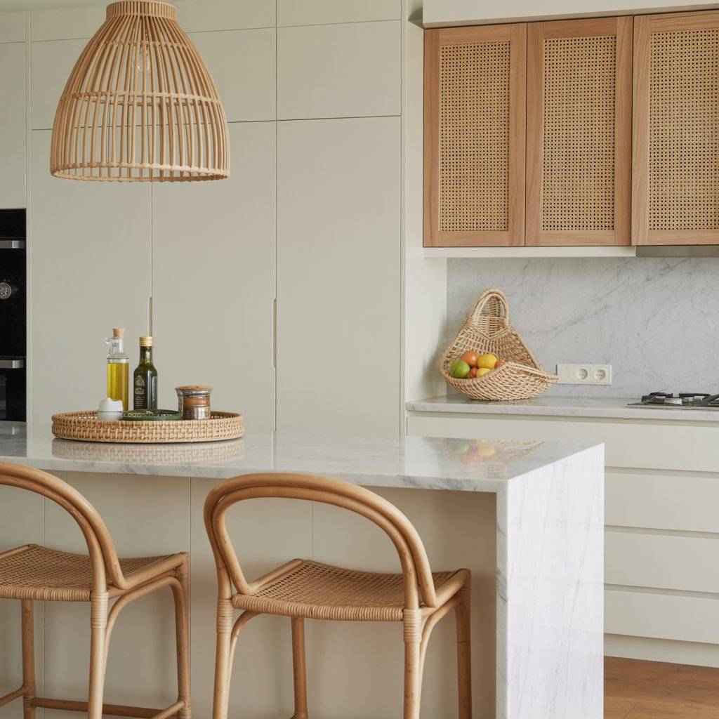 When I talk about natural rattan touches, I don’t mean turning your kitchen into a beach hut. Rattan works best in small, thoughtful pieces. Think bar stools with woven seats, pendant lights with rattan shades, or even cabinet inserts with cane webbing.