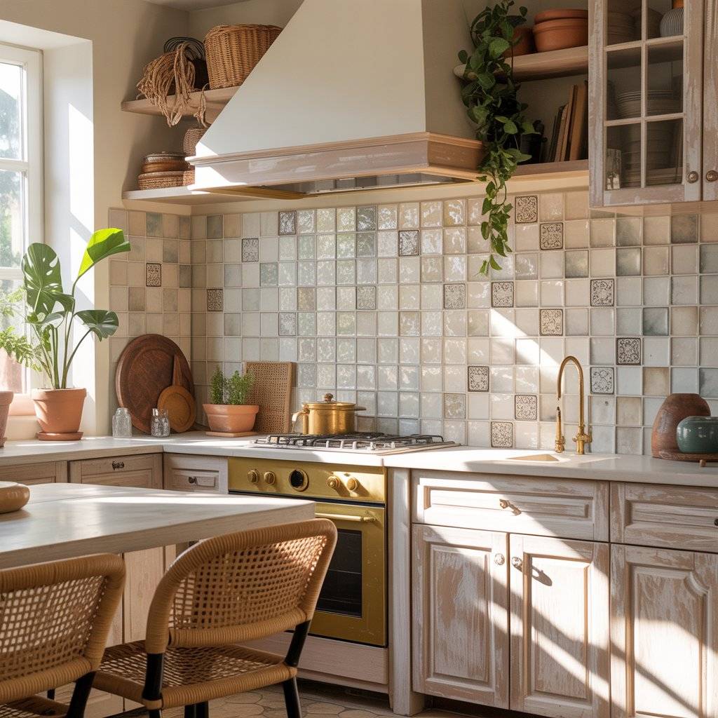 Tile can either overpower a boho kitchen or quietly support it. For a sunlit look, I prefer simple backsplashes in natural tones. Handmade-style ceramic tiles with slight imperfections work beautifully because they add texture without loud patterns.