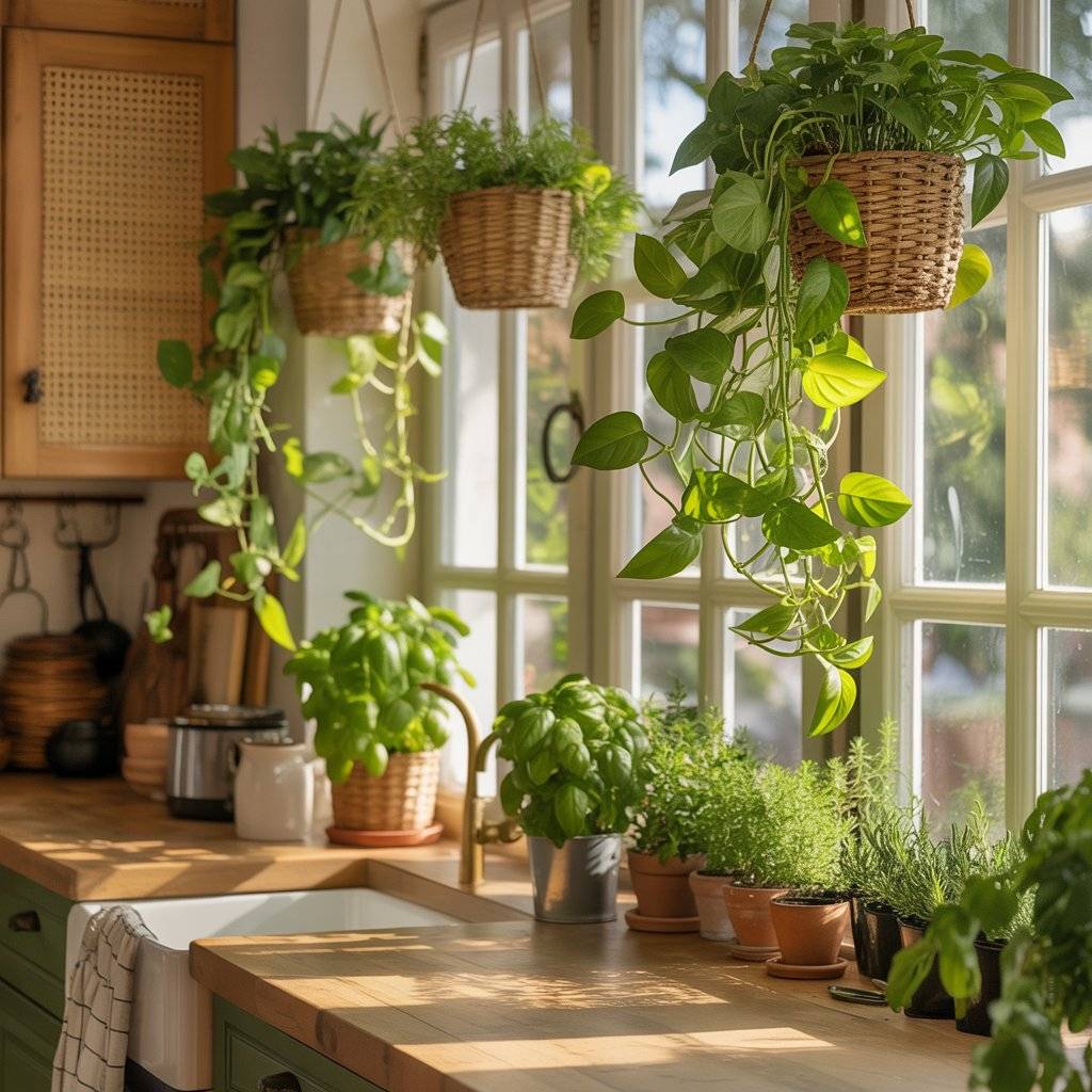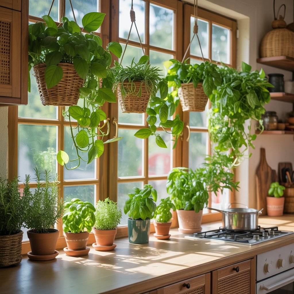Hanging planters near windows work well, especially in woven or rattan holders. You can also place small herb pots on the windowsill for both beauty and function. Fresh basil or rosemary not only looks good but is useful when cooking.
