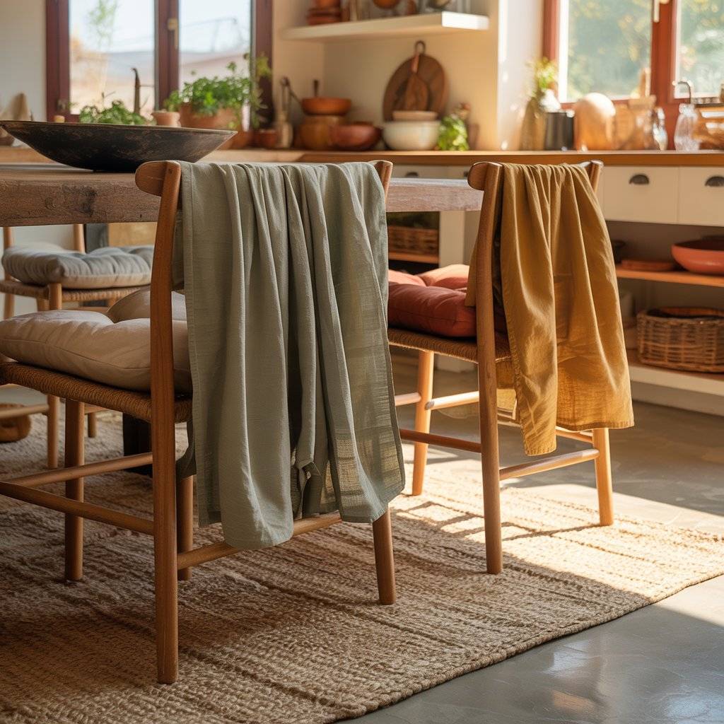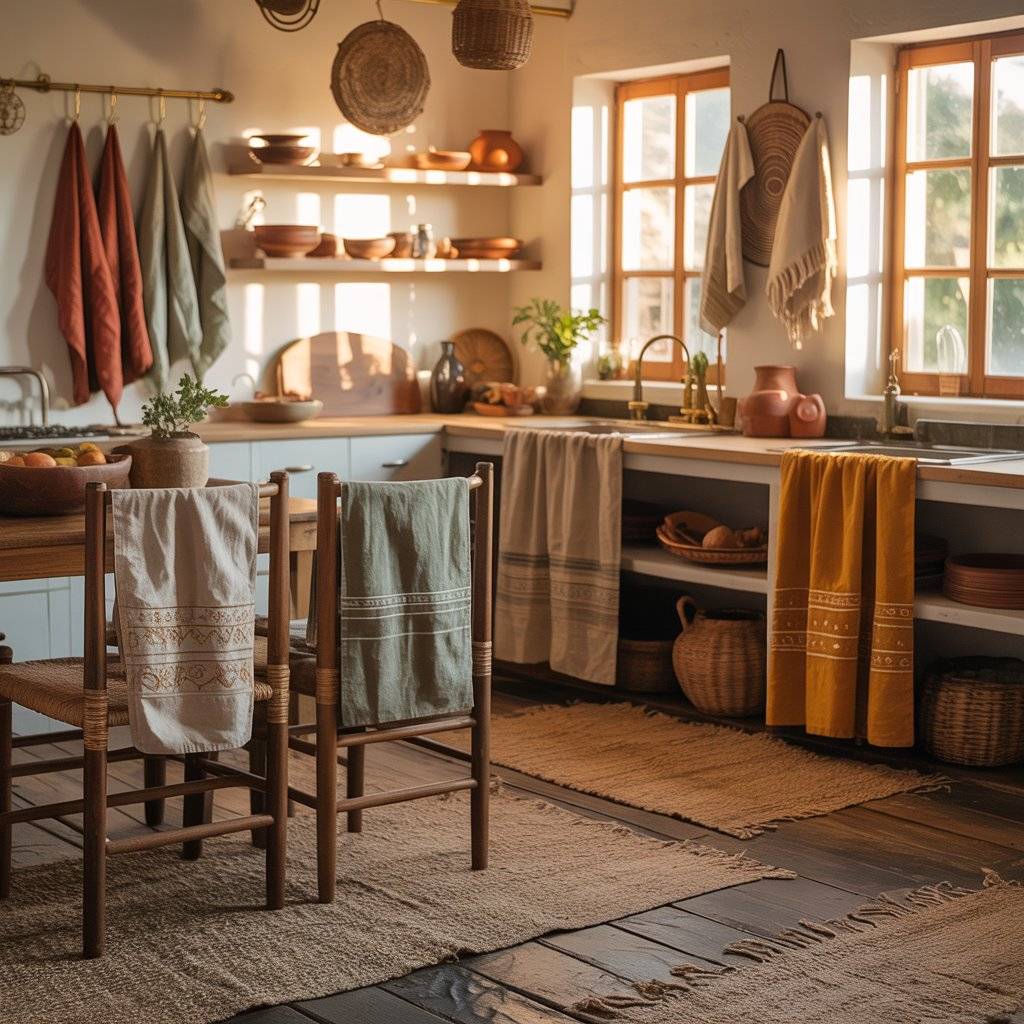 A boho kitchen should feel relaxed, not stiff. Textiles help with that. I usually suggest layering simple fabrics instead of using bold patterns everywhere. Start with a neutral base like a jute or flat-weave rug. Then add soft linen kitchen towels in warm tones like rust, sage, or mustard.