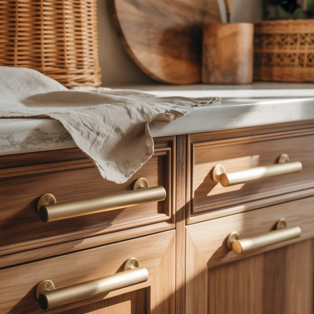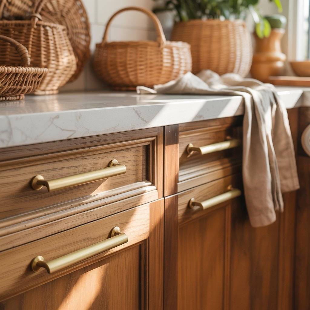 If you’re updating on a budget, changing hardware is one of the easiest upgrades you can do in a single afternoon. Look for simple shapes instead of ornate designs. Clean lines keep the kitchen feeling modern, while warm finishes keep it relaxed.