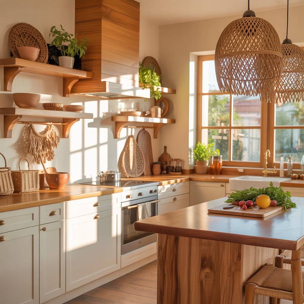 Wood plays a big role in a sunlit boho kitchen design. I’ve learned that the tone of the wood matters more than people think. Very dark wood can make the space feel heavy, especially if the kitchen is small. Lighter woods like oak, ash, or even bamboo reflect sunlight better and keep the room feeling open.