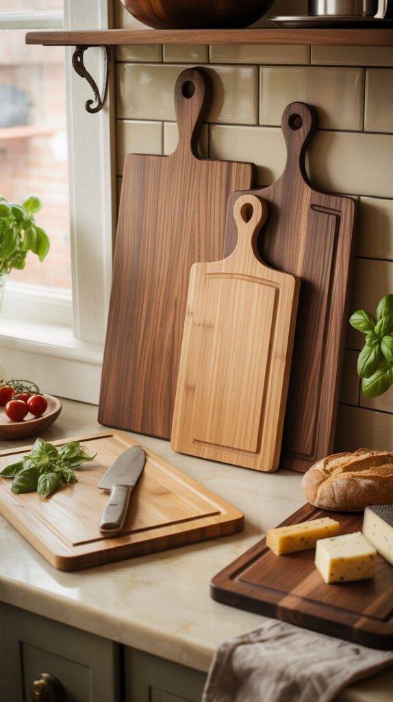 Details: A functional kitchen essential that doubles as a decorative element. Solid wood boards in oak, bamboo, or walnut complement boho and rustic designs. Perfect for chopping, serving, or displaying baked goods.