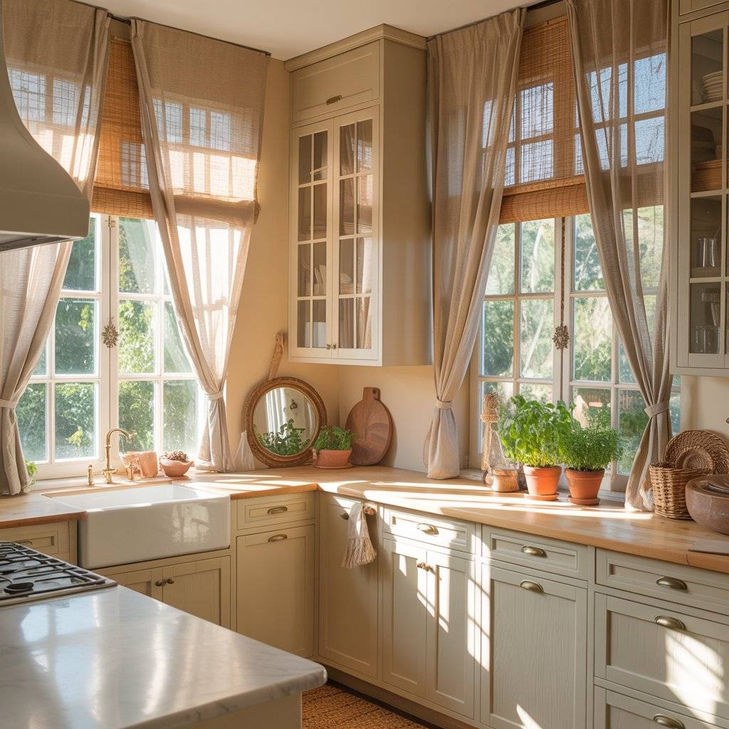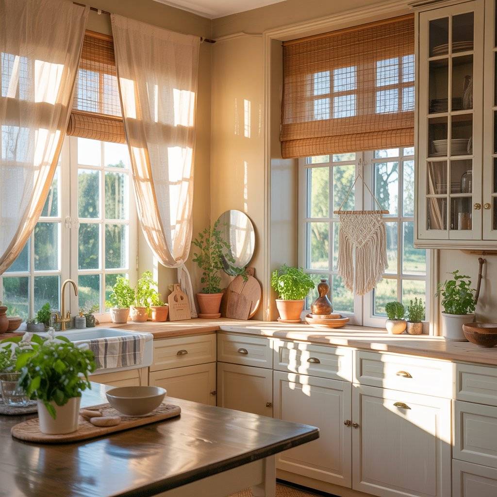 In a sunlit boho kitchen, light is not just a bonus it’s the starting point. Before adding decor, I always look at how sunlight enters the room. If you have large windows, avoid heavy curtains. Go with sheer linen panels or simple woven shades that filter light instead of blocking it. If privacy is not an issue, keep windows as open as possible.
