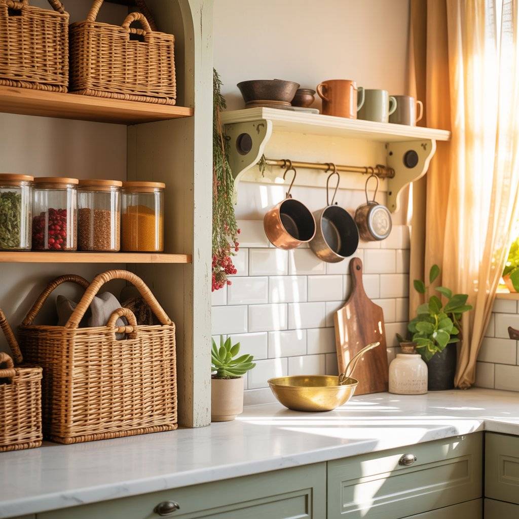A sunlit boho kitchen design should still function well. I always remind people that style should never get in the way of storage. Use woven baskets to hide clutter inside open shelves. Store dry goods in clear glass jars with wooden lids. These choices look good but also keep things organized.