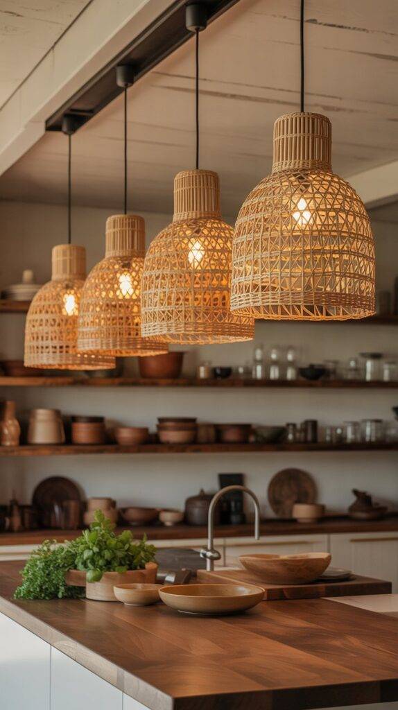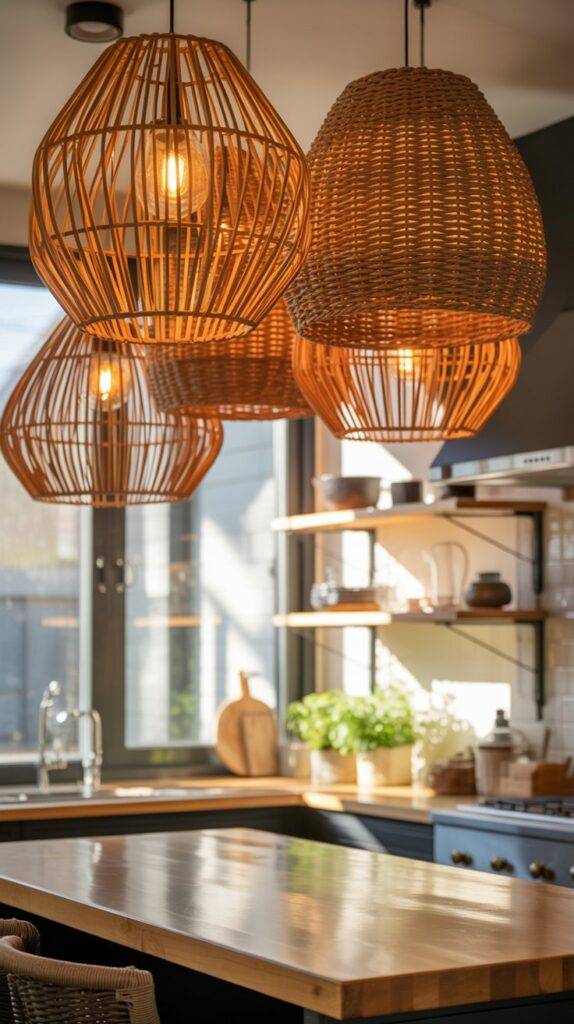 If you have a kitchen island, hanging two or three woven pendants above it creates a natural focal point. They don’t need to be oversized. In fact, medium-sized shades often look better and feel less overwhelming.