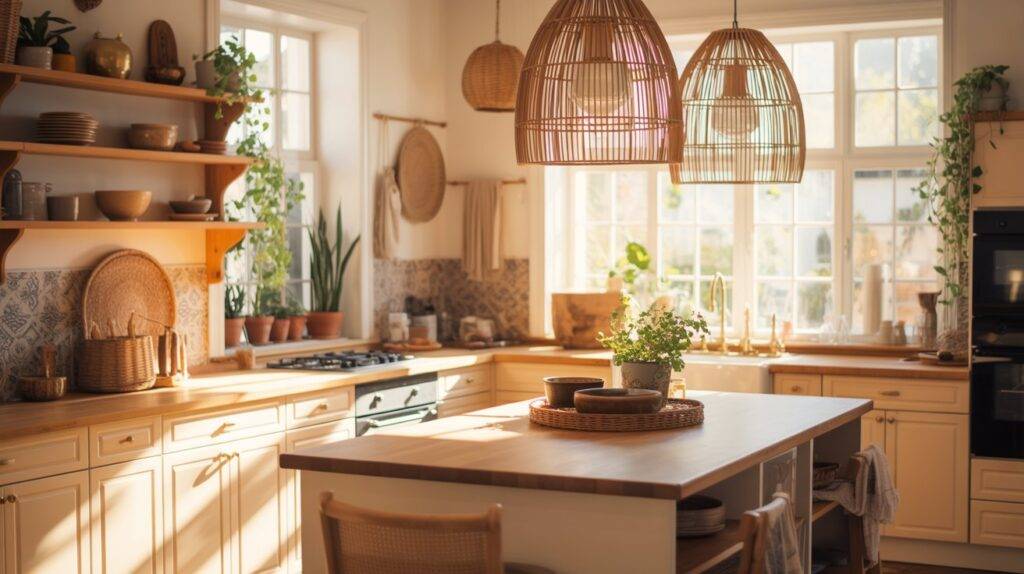 What works well is pairing warm light bulbs with natural materials. Avoid cool white bulbs because they can make the space feel sterile. Warm bulbs highlight the texture in rattan and wood. Even a simple switch from a metal shade to a woven one can instantly bring your kitchen closer to that sunlit boho feel.