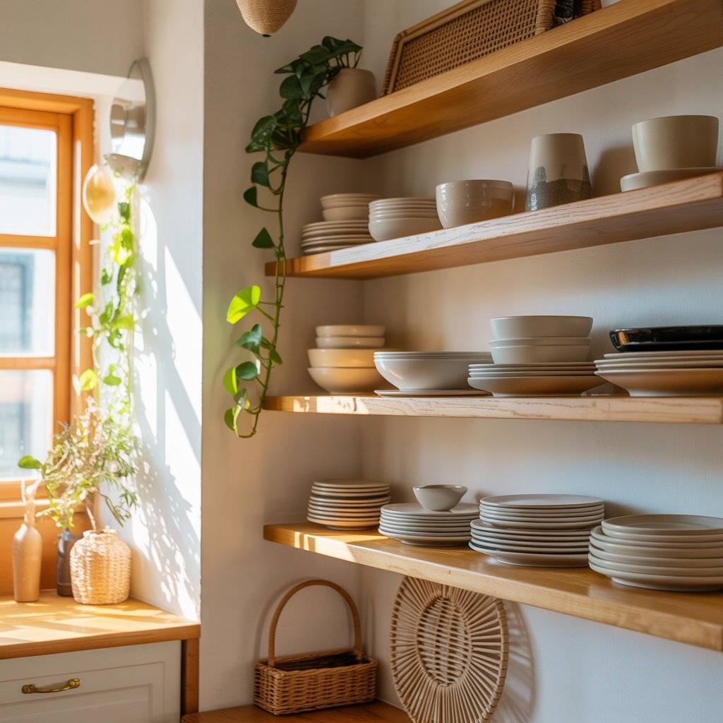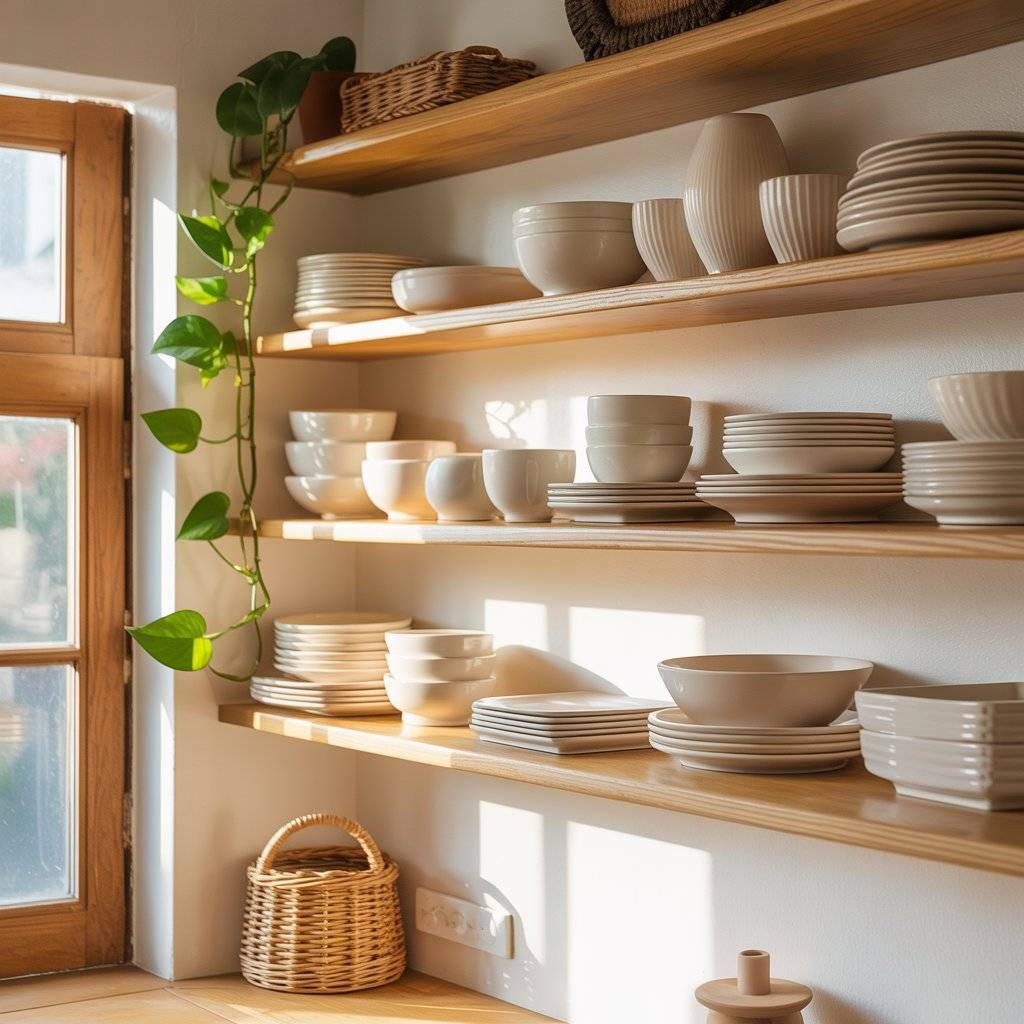 Stick to neutral dishes white, cream, or earthy ceramics. Stack plates neatly and leave space between items. Mix practical pieces with a few decorative ones, like a small plant or a woven basket. If everything is colorful, the shelves will feel chaotic.